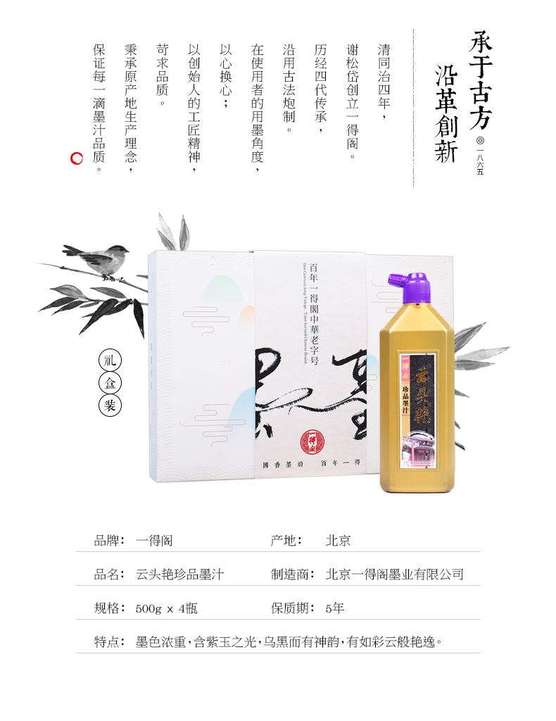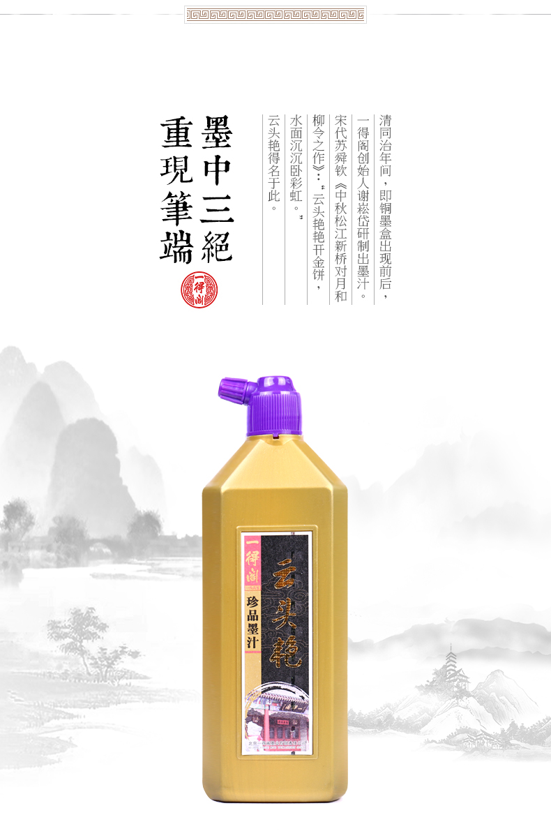 強(qiáng),是工筆畫必備之材料。云頭艷墨汁是一得閣奉獻(xiàn)給書畫界的精制珍品,是藝術(shù)家創(chuàng)作之首選。