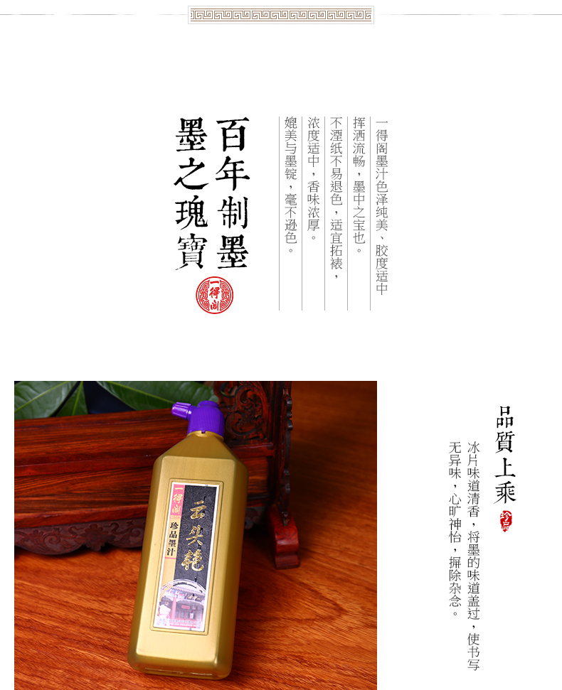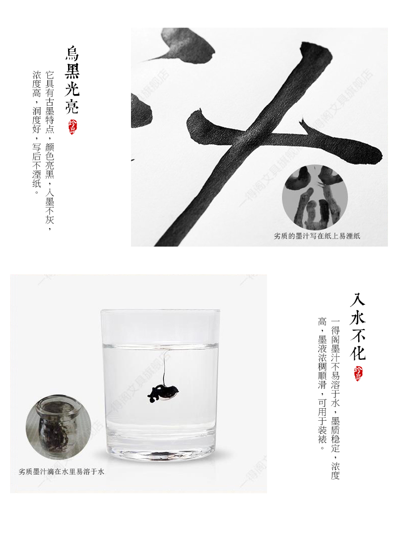 該產(chǎn)品特點(diǎn):質(zhì)感細(xì)膩,膠度適中,墨色濃重、墨跡清透不失穩(wěn)重、黑中透著紫玉之光,層次感