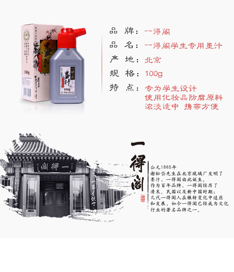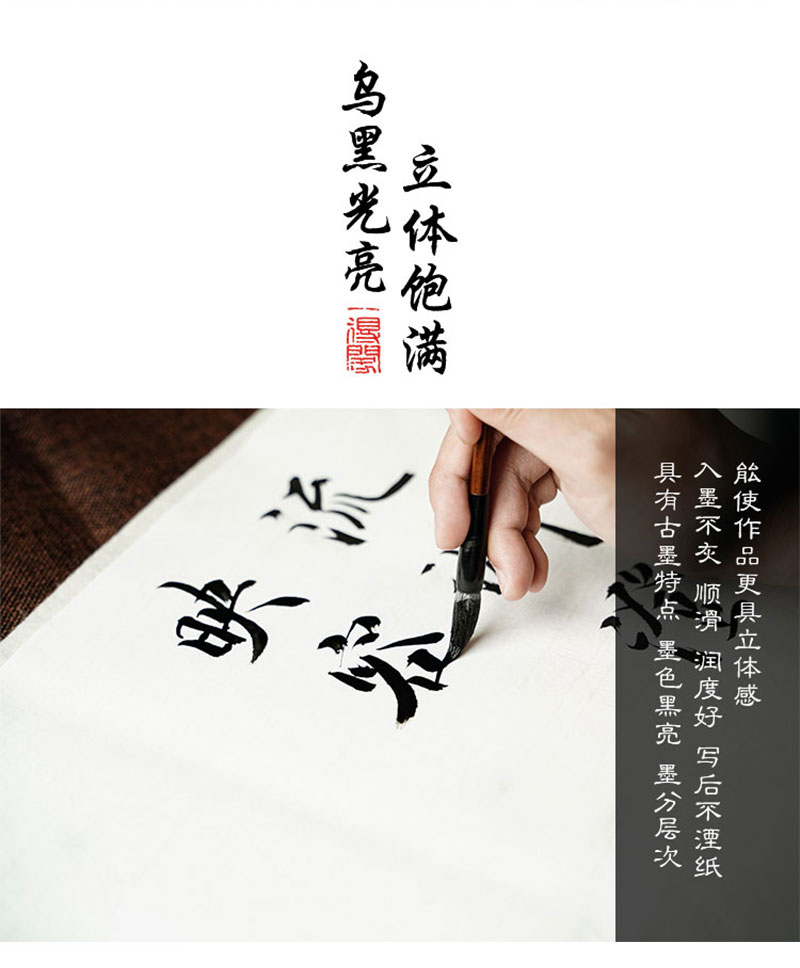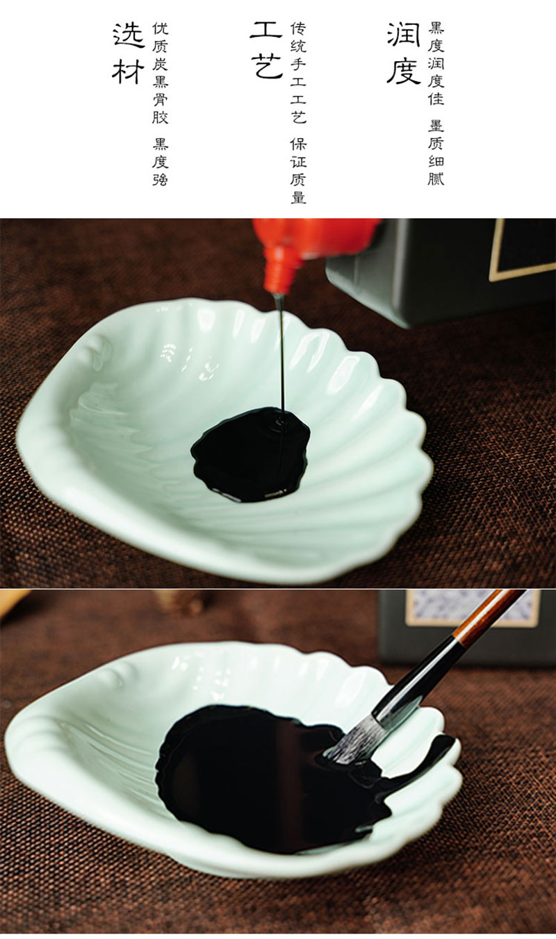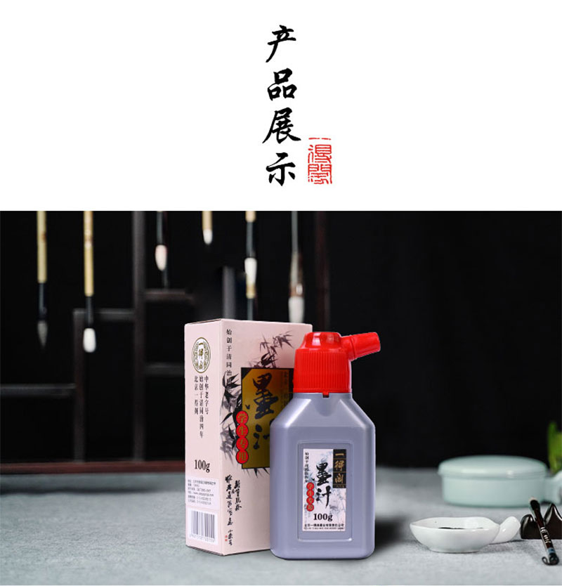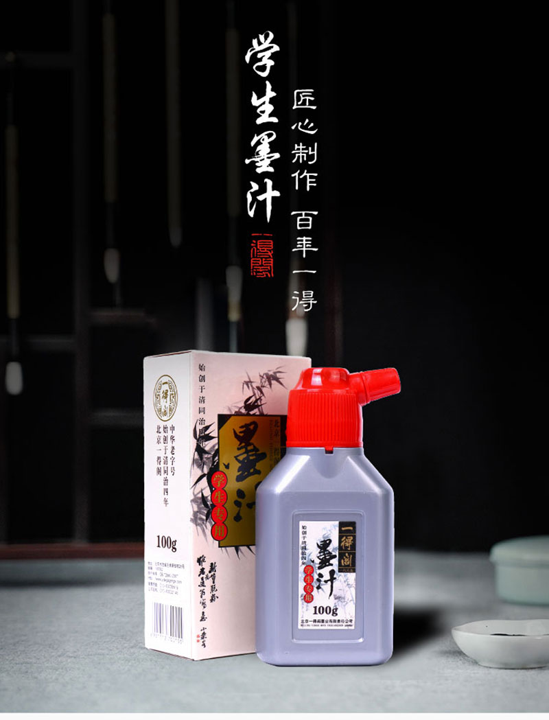本產品選用優(yōu)質材料并采用傳統(tǒng)工藝,專為中小學生制作。是中小學生練習書法繪畫首選產品。其特點墨色濃淡適中,宜書宜畫,因不是作品專用墨汁,所以使用該墨汁的書畫作品不適宜托裱。