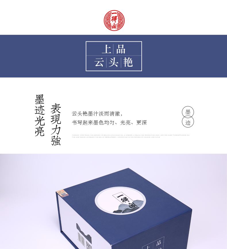 一得閣上品云頭艷,除保持一得閣一貫的墨汁均勻,五色分明、淡而清澈、濃亦透亮的特點(diǎn)