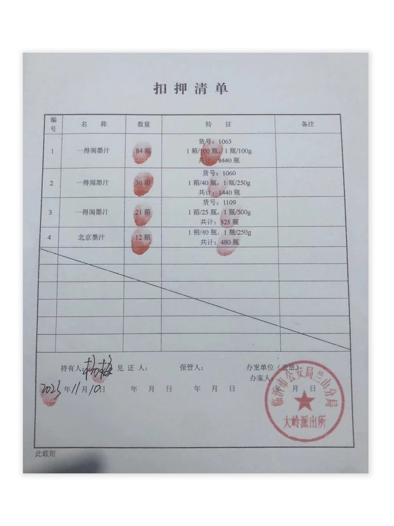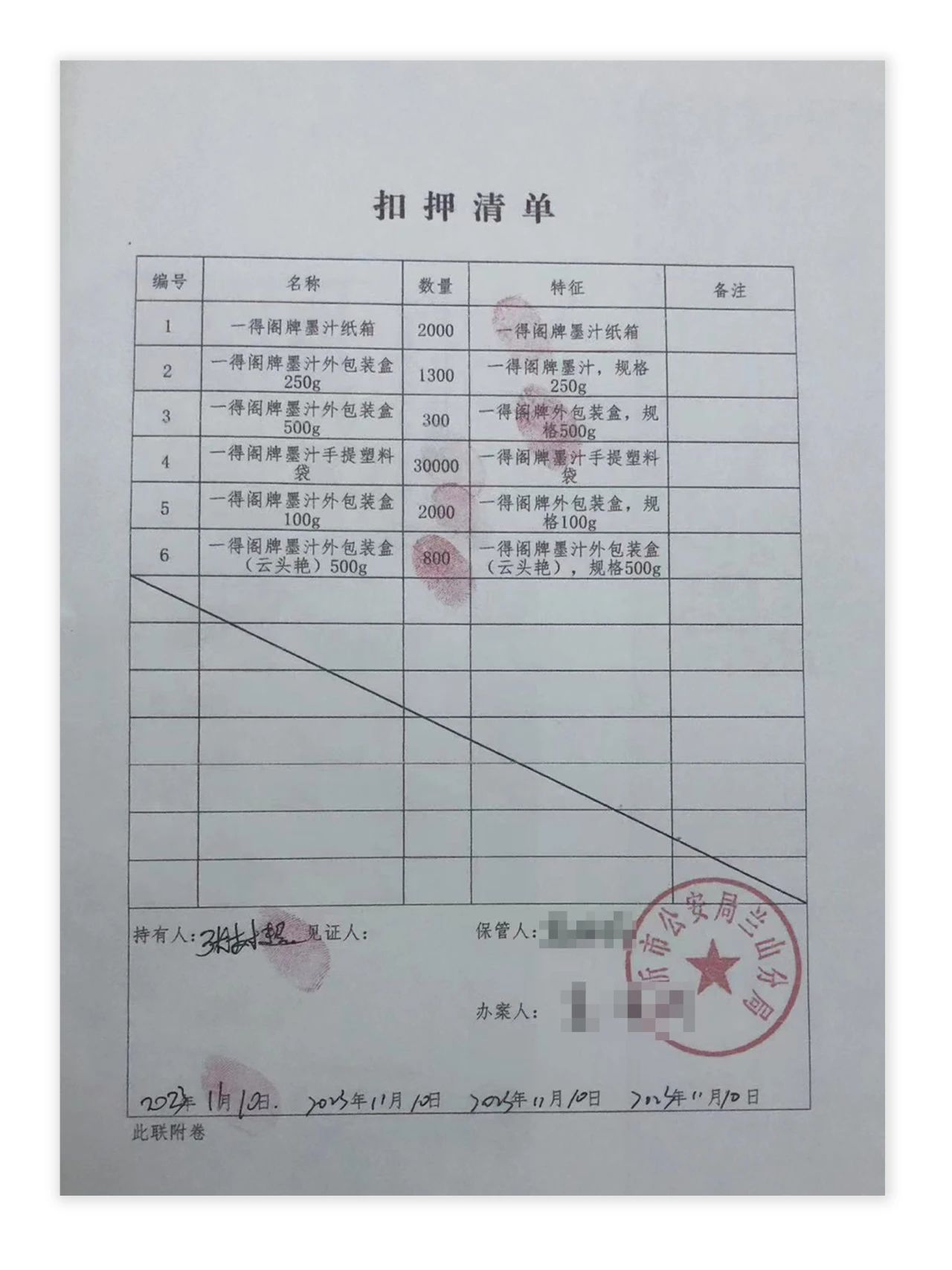 近日,山東省臨沂市公安局藍山分局查獲扣押一批假冒一得閣注冊商標的偽造產(chǎn)品,相關(guān)涉事人員已被刑事拘留,等待刑事審判。此次查獲的涉案產(chǎn)品數(shù)量龐大,覆蓋一得閣多個經(jīng)典產(chǎn)品,包括一得閣精制、云頭艷、書畫、北京等多個產(chǎn)品合計10885瓶。同時也發(fā)現(xiàn)了大量假冒包裝材料,其中包括一得閣紙箱、外包裝盒、手提塑料袋、防偽標等共計超70000份。