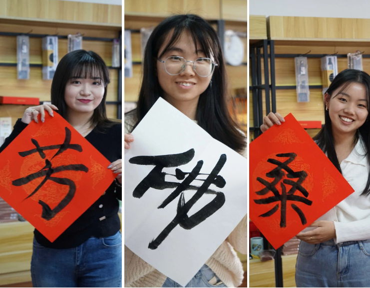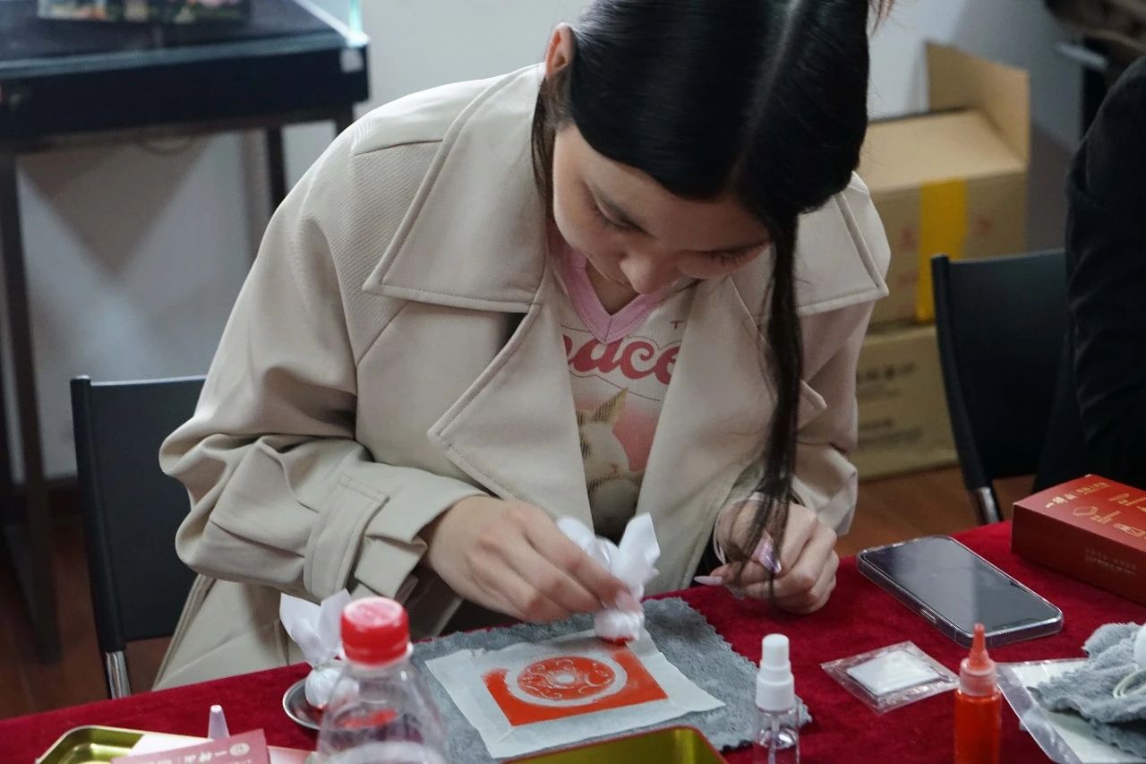 一得閣為此次研學實踐活動特別準備了“傳古拓今·墨韻國潮”禮盒,內(nèi)含拓版、拓包、朱墨等拓印所需全部用具。拓印是一得閣古法制墨最后一步“檢驗”里的重要環(huán)節(jié),通過拓印可以清晰直接地觀察到墨汁的顏色與效果。拓印活動后,在一得閣同事的帶領下,同學們紛紛體驗書法文化,在實踐中親身感悟中華文化之美。