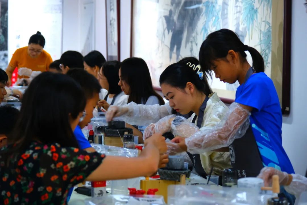 隨后,活動(dòng)進(jìn)入古法制墨體驗(yàn)環(huán)節(jié)。在傳承人魏光耀的親自示范和手把手指導(dǎo)下,大家興致盎然地投入到傳統(tǒng)墨汁的制作過(guò)程中。從選料到調(diào)和,再到體驗(yàn)關(guān)鍵的古法工序,大家親身體驗(yàn)了一得閣墨汁的制作匠心與墨色變幻的奧秘。指尖沾染墨香,不僅是對(duì)技藝的初探,更是對(duì)千年文脈的深情觸碰。